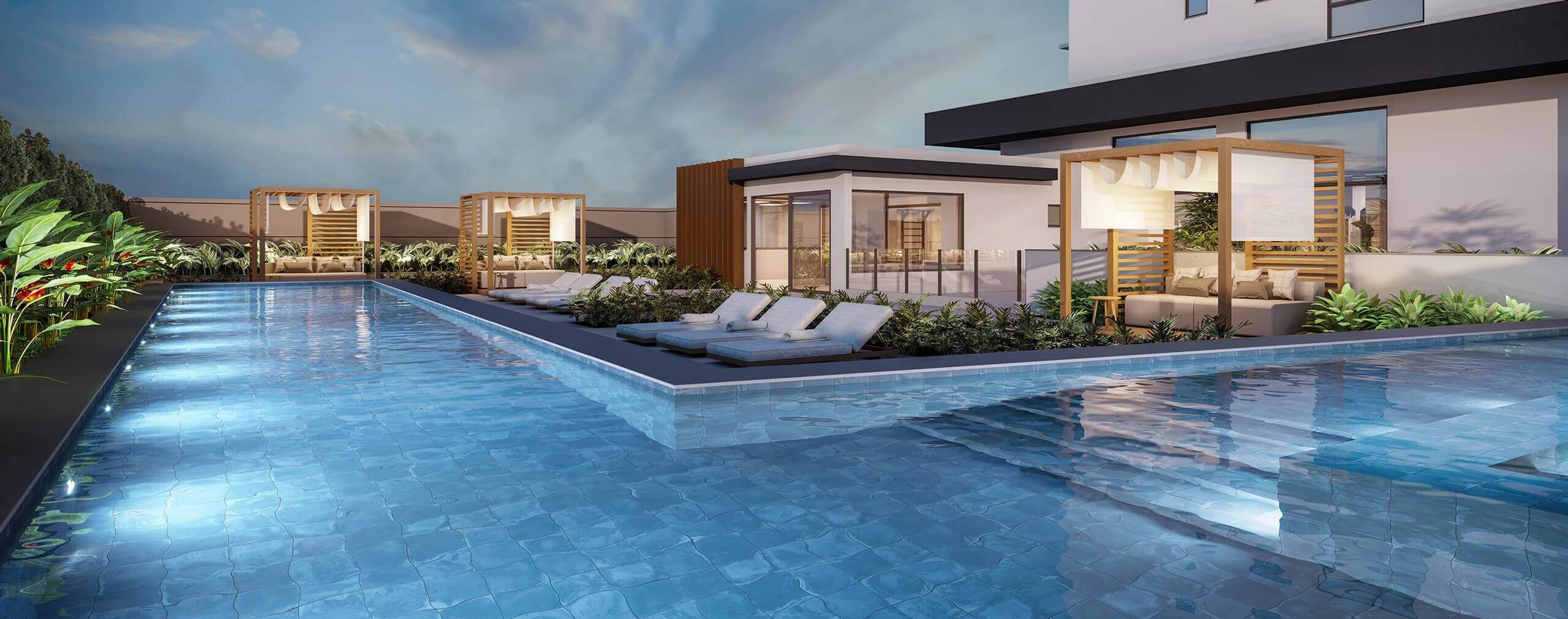 O Complexo contará com Sauna, Piscina com raia e Spa, Academia, Espaço Yoga e sala equipada para massagem. Todos esses ambientes ficam próximos à piscina, oferecendo aos moradores a experiência exclusiva.
